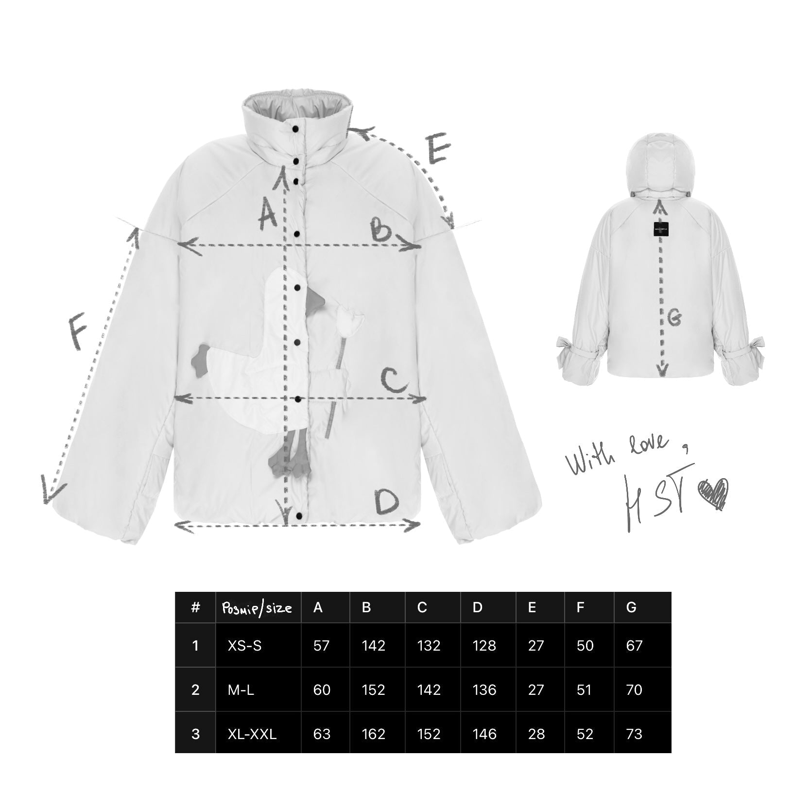 При виборі розміру, радимо орієнтуватися більше на зріст та довжину руки (параметри Е та F), ніж на об’єми, бо сама куртка досить об’ємна і має вільний комфортний крій.